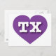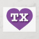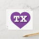 This postcard features a vibrant purple heart containing the bold, white, upper case letters TX, the official abbreviation for Texas, the Lone Star state. The reverse side of the postcard is blank, awaiting your personalised text or handwritten sentiments.