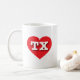 This mug features a vibrant red heart containing the bold, white, upper case letters TX, the official abbreviation for Texas, the lone star state.