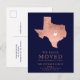 send your new address to friends and family with this modern navy blue and rose gold foil map of the state of texas with modern typography. Perfect moving announcement. Move the heart around to your location.