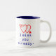 This is a blue, red and white ringer mug featuring the popular text 'I miss you already'. A great gift mug for someone you care about. The text is easily personalised to say anything you like easily. It also features two red hearts bound together with an arrow through it.