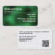 A business card with a textured metallic emerald green foil background. Includes space for your name, business name, contact information and a special message on the back for your customers.