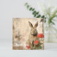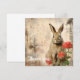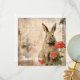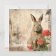 A brown rabbit is depicted in front of an abstract background, looking directly at the viewer with an attentive gaze. In the foreground, the rabbit is accompanied by a stem of vibrant pink roses, contrasting with the subdued tones of the backdrop.