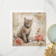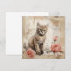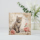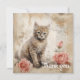 A fluffy tabby kitten with striking blue eyes is sitting next to two pink roses against a backdrop featuring vintage script and ink blotches. The sepia tones give a warm antique feel to the composition, which combines florals and a cute animal subject.