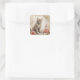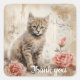 A fluffy tabby kitten with striking blue eyes is sitting next to two pink roses against a backdrop featuring vintage script and ink blotches. The sepia tones give a warm antique feel to the composition, which combines florals and a cute animal subject.