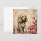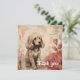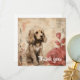 A golden brown puppy with fluffy fur is sitting quaintly next to a couple of large, stylised roses. The background features abstract beige tones with subtle floral outlines and script-like markings, giving a soft, vintage feel to the whole composition.