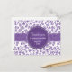 This design is a purple and white number pattern with a purple milestone number 80 repeated in varied sizes and angles over a white background. There is a circle in the center for your custom text. The back has room for the name, address, and a short personal message.