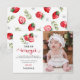 Pretty strawberry birthday thank you card, featuring watercolor illustrations of juicy red strawberries, greenery and white blossom. The elegant calligraphy script font reads - "thank you 'Berry Much'". Simply add a photo of your choice and customise the thank you message and name.