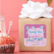 Beautiful birthday party "Thank You" sticker with pink, blue and violet watercolor flowers, green swirls and piece of parchment for your text, over purple and baby pink background with white polka dots. Cute, colourful, girly design, perfect for spring/summer birthdays.