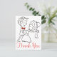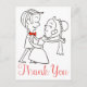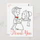Who says your wedding thank you notes have to be boring? Show your fun loving personality with these cute dancing couple thank you post cards. The cards features a hand drawn black and white cartoon of a dancing bride and groom with thank you printed in a red script font highlighted against a crisp white background.
