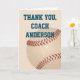 Say thanks to your favourite baseball coach with this greeting card. Both the message on the front and the inside of this card is ready to be customised with your own personalised message. It features a distressed style illustration of a baseball against a soft cream coloured background with your message in sporty style bold blue lettering.