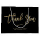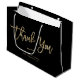 This modern and stylish, black retail shopping bag features the words "thank you" in trendy, faux gold look handwritten script typography. Add your business or company name and website or other info for a bag your corporate customers will want to show off.