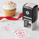 Cute round thank you for your order pre inked stamp for a cupcake shop or home baker's small business. The whole design is framed with a curvy circle and within it, in the middle there is a cute cupcake illustration. Left and right of the cupcake and on the bottom there are decorative hearts. Custom text consist of a pretty cursive script curved line that is meant to contain the baker's or bakery name. Below, in a neat print there are two lines expressing gratitude for the customer's order. All three lines of text can be personalised with your own name and message.