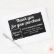 Thank you for your purchase, a message to appreciate the purchase of your customer. Customisable sticker that you can put your business name and with message Thank you for your purchase. Designs are white texts on black background and rectangle shape. To customise this sticker, upload your business logo, type your business or company name, address and phone number. After uploading logo and typing texts, please check the appearance. If the appearance is pleasing to you, you can place your order now. If you need to resize and move the logo and texts to fit on this sticker, please change in the design tool. You can also make other changes according to the appearance that you prefer in the design tool such as changing the background colour, font colour and font style. Sticker to appreciate the purchase of your customer. Sticker that you can also use as marketing material to advertise your business and to promote your brand name or build brand name awareness.