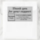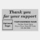 Customisable sticker with message Thank you for your support. Sticker to appreciate the support of your customers or clients. You can also use it as marketing material to advertise your business and to promote your brand name or build brand name awareness. Designs are black texts on grey background and rectangle shape. To customise this sticker, upload your business logo, type your business or company name, address and phone number. After uploading logo and typing texts, please check the appearance. If the appearance is pleasing to you, you can place your order now. If you need to resize and move the logo and texts to fit on this sticker, please change in the design tool. You can also make other changes according to the appearance that you prefer in the design tool such as changing the background colour, font colour and font style.