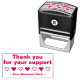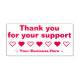 This rubber stamp design features the thankful message "Thank you for your support" and a customisable company name. It also features a decorative heart shape. It could be used by a company, a business, an organisation, or a professional to show gratitude to clients or customers for their business.