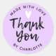 A personalised lavender purple1 1/2 inch "made with love, thank you" sticker on a red coloured background. Make it yours by adding your own name. A pretty finishing touch for all of your handmade and homemade gifts. Comes in a 3 inch size as well. Perfect to thank customers in your homemade crafting business. Designed for you by Blackberry Boulevard.