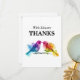 The Wedding Thank You Card from the "Rainbow Lovebirds Collection" offers a charming way to express gratitude to your guests with its captivating design and vibrant elegance. Measuring 7x5 inches, this flat card features delightful artwork inspired by the colourful beauty of rainbow lovebirds, creating a joyful backdrop for your message of thanks. On the front of the card, the caption "with Sincere Thanks" is elegantly displayed against a backdrop of vibrant rainbow hues, evoking a sense of warmth and appreciation. The playful charm of the rainbow lovebirds adds a touch of whimsical elegance to the design, setting the tone for your heartfelt message. Turning to the back of the card, against a pristine white background, there is ample space for your personalised message. Here, you can convey your gratitude with customisable text, adding a personal touch to each card. Include the couple's names, wedding date, and location to make the message more meaningful and memorable for your guests. This Wedding Thank You Card is a thoughtful addition to the "Rainbow Lovebirds Collection," which offers a range of coordinated stationery options to enhance your wedding celebration. From invitations to place cards and more, each piece in this collection complements the theme of vibrant love and inclusivity, ensuring a cohesive and visually stunning presentation for your special day. Embrace the joy and beauty of your wedding with this heartfelt expression of gratitude.