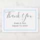 Wedding labels for mini-sparkling wine bottles with minimalist design. Grey text in larger script for "thank you" and printed text for names and date. White with a single, thin line frame in blue around edge of sticker. Easily change the colour of the line in the "customise further" area.