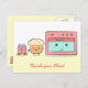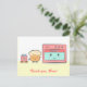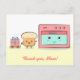 A kawaii cartoon of a cupcake with rainbow sprinkles pulling on a wooden platform with wheels to give a wrapped present to its mother, the pink oven. Message reads "Thank you, Mum!" A perfectly whimsical and sweet postcard that is sure to amuse and make Mum happy on Mother's day or any other day just to show your appreciation to Mum. Designed by Rusty Doodle.