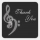 A set of classy simple black/white music themed Thank You square stickers- white treble and bass clefs against a textured black background. Music Love.