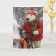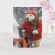 A polar bear wearing a red coat and hat skillfully operates a snowblower, sending plumes of snow into the air against a snowy backdrop.