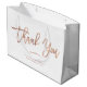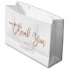 This modern and stylish, white retail shopping bag features the words "thank you" in trendy, faux rose gold look handwritten script typography. Add your business or company name and website or other info for a bag your corporate customers will want to show off.