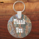 This appreciation keychain feature a rustic tree bark photo that captures green and brown bark with curved lines. This beautiful tree trunk pattern provides a gender-neutral earth tone background for "Thank You" which appears in the centre in white font.