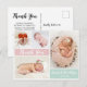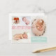 Modern, Girly Pink and Turquoise Thank You Baby Birth Announcement 4 Photo Collage Postcards. Elegant, cute photo birth announcement template featuring four (4) of your favourite baby photos with a pretty hand lettered script in white on pastel soft pink and aqua or teal turquoise colour blocks. Add your baby's name, thank you message and birth stats. Easily to personalise it.