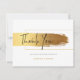 Elegant modern and simple wedding design featuring Thank you- black hand script typography on a gold single brushstroke.