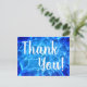 Aqua blue swimming pool water photo with a bright filter. White calligraphy style "thank you" text. Create your own thank you postcards after your special event at a poolside venue.