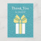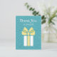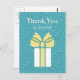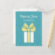 A stylish light teal and yellow animal print thank you postcard with a trendy giraffe pattern background and a girly wrapped gift with a cute yellow leopard print ribbon tied into a cute bow. Personalise the back by adding a special message of thanks to the custom text area.