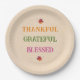 Thanksgiving party paper plates in whimsy typography "Thankful, Grateful, Blessed" with a fall leaves details.