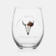 This Western Friendsgiving or Thanksgiving custom wineglass features hand-drawn Western cow skull adorned with roses illustration in black ink, with the editable text, "Thankful Grateful Blessed". Personalise with your family name.