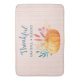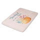 A bath mat with typography text which says: Thankful grateful blessed. perfect for the thanksgiving season. An image of an orange watercolor pumpkin with autumn leaves and sprigs. Pink and gold striped pattern for the background.