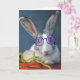 Thanks for the Gift, paper greeting card with a rabbit wearing round shades in violet and unwrapping a gift of cauliflower and carrots. Art, image, and verse copyright © Shoaff Ballanger Studios, 2022.