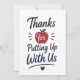 A fun and relatable teacher appreciation design featuring “Thanks for Putting Up With Us.” This lighthearted message reflects the everyday classroom experience in a humorous and honest way. Perfect for students who want to say thank you with a smile, this design creates a memorable and engaging gift.