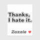 Grab this "Thanks, I hate it." funny saying tee shirt for awkward social events and cringeworthy moments. Show your sense of humour by wearing this basic cool text style. for Black and White Contemporary Art Lovers. I'm sure that it can spark many conversations and will help with breaking the ice. This funny awkward design is a great gift idea for employees, colleagues, coworkers, managers, supervisors, friends, or family, and also makes a great birthday, holiday gift, or Christmas present. Celebrate any occasion with a touch of personality and comfort! (YOU CAN CHANGE AND CUSTOMIZE THIS TEXT DESIGN OR ANY TEXT YOU WANT IN TEXTIFY STORE!).