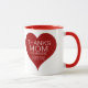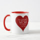 A mug with a lovely THANKS MOM FOR HAVING ME. I LOVE YOU! typography in white letters on a red heart on both sides of the mug.