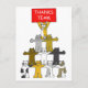 Cartoon cats of different colours, standing on top of each other's shoulders in a pyramid shape. The top cat is holding up a red sign that says 'Thanks Team'. The image is set against a white background.