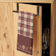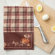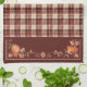 Celebrate the all-American holiday of Thanksgiving with old fashioned decorations. This kitchen towel has a border of autumn leaves a brown plaid background.