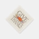 The words 'Give Thanks' are printed in nut brown against a cream coloured square. The design is centred with a grouping of fall botanicals in oranges, soft lavenders, tans and greens and comprised of a pumpkin, berries, fall leaves and twigs. These napkins would make lovely additions to your autumn Thanksgiving table. A simple yet heartfelt message that is appropriate to the fall season.