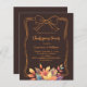 A bistre, dark brown coloured background. Decorated with muted coloured fall leaves and a hand-drawn bow. Personalise and add the party details.