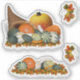 * A bountiful horn-shaped wicker basket with pumpkins, gourds, fall leaves and more.