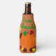 This bottle cooler has a Thanksgiving design of a pumpkin with a pile of leaves and falling leaves and reminds people to give thanks.