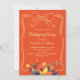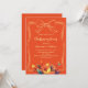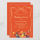 A pumpkin orange coloured background. Decorated with fall leaves and a hand-drawn bow. Personalise and add the party details.