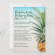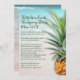 A tropical themed Thanksgiving, or Christmas, family dinner menu template. Text is easy to customise over a sea and sand background image. A single, large pineapple decorates the right edge of the paper. Blue-green text is aligned to the left with a place for the title, with family name / names at the top. List all menu items in a paragraph, which also aligns left. If you wish, include the name of the cook, baker, chef next to each line of the menu. This could become a new family tradition with menus to save and remember each special holiday.