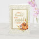 Thanksgiving card with “Give Thanks with a Grateful Heart” in a handwritten font, surrounded by a autumn leave and pumpkin wreath. Background has a subtle leaf and acorn pattern.