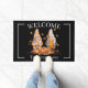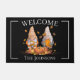 Thanksgiving Gnome Welcome Doormat: Welcome guests to your home with this elegant fall gnome welcome doormat, perfect for adding a touch of charm to your autumn décor. This design features the word "welcome" at the top, written in white for personalisation, giving your entrance a cosy, customised feel. In the centre, two adorable watercolor gnomes bring the festive spirit of fall to life—one holding a slice of pie, while the other proudly holds a turkey. Surrounded by vibrant pumpkins at their feet and falling autumn leaves, this whimsical scene is framed in white against a striking black background. Add your family name or personal message at the bottom for a truly unique touch. This fall-themed doormat makes a great addition to your front porch or entryway, combining warmth and elegance with seasonal charm.