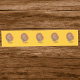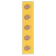 This table runner is a vibrant golden yellow colour with a row of male turkeys with their tail feathers spread standing in Fall coloured leaves with brown and orange feathers.