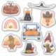 is a set of lovely and creative stickers that feature nine different designs related to Thanksgiving. These stickers include images of a turkey, a pumpkin, a pie, a cornucopia, a leaf, a pilgrim hat, a Native American headdress, a feather, and a banner that says “Happy Thanksgiving”. These stickers are ideal for adding some fun and charm to your planner, journal, cards, envelopes, gifts, or anything else you want to celebrate the occasion.